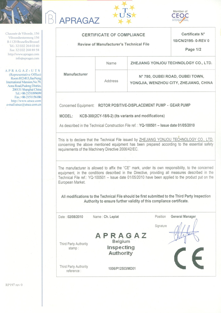 CE 国际产品认证(容积泵)