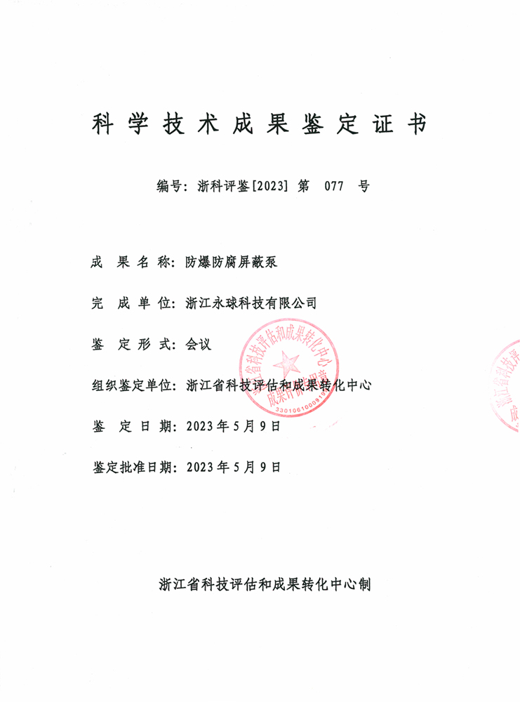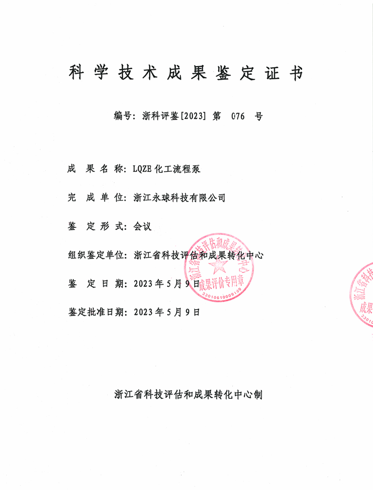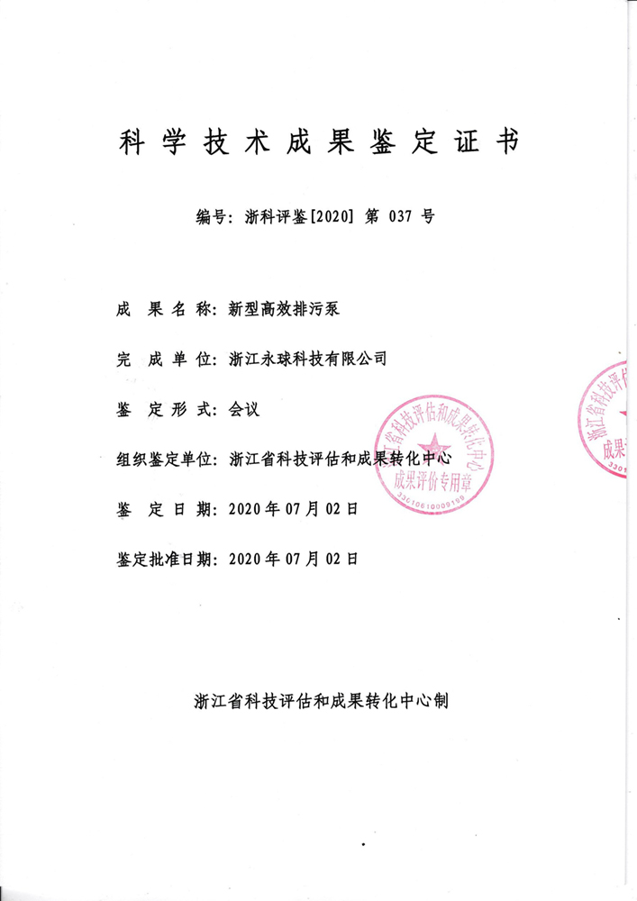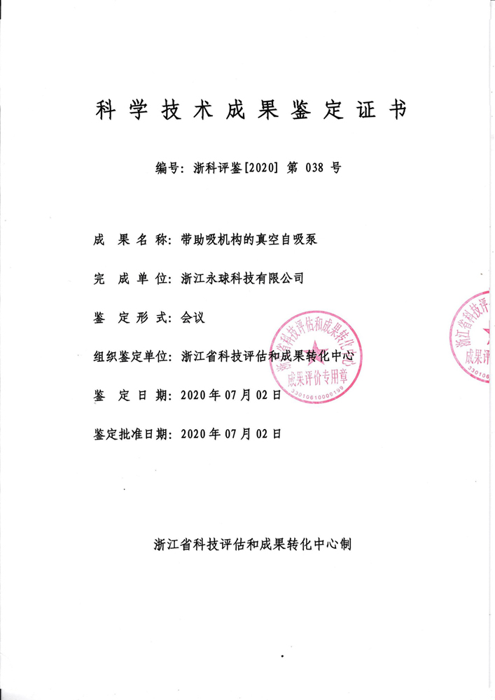 科学技术成果:带助吸机构的真空自吸泵鉴定证书