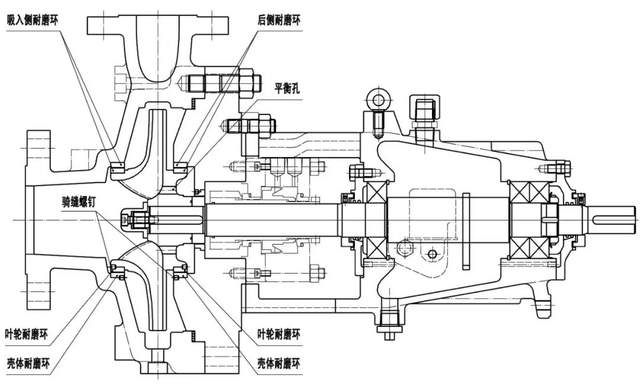 3)后侧耐磨环(如果有)通常与平衡孔配合使用(平衡孔穿过叶轮后盖板与叶轮吸入口相通),以降低叶轮背部的压力,从而降低泵转子的轴向推力(及密封腔压力)。