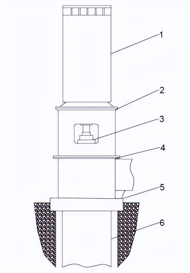 如图1所示,泵组分为基础以上部分(依次为:1. 立式电机,2. 电机架,3. 水泵推力轴承箱,4. 出水弯座,5. 底板)和基础以下部分(为:6. 泵体及转子部件)。