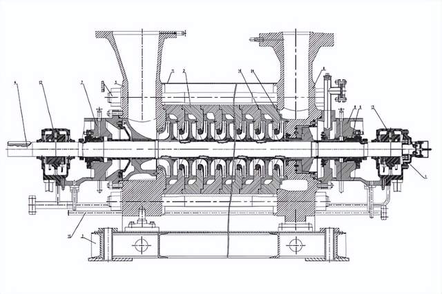 该型泵为卧式、节段式、多级、单壳体离心泵,具有环形入口和组合出口。该泵的特点是叶轮对称布置。对于这种布置,泵设计中没有平衡装置。当运行模式从额定流量频繁变换为再循环流量时,这种设计会提高泵机组的可靠性。其余的轴向力由可倾瓦推力轴承承担。